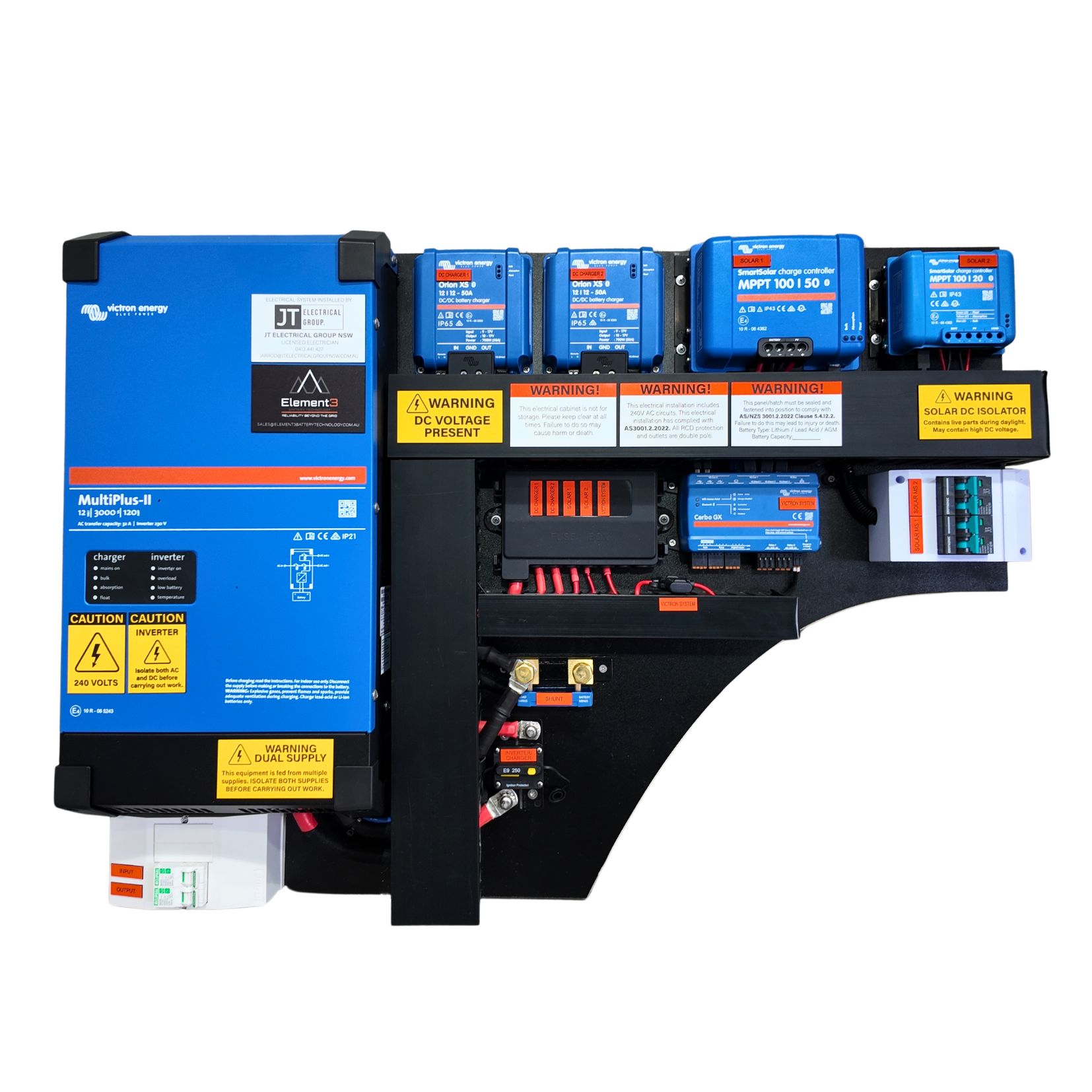- Victron 3KVA MultiPlus-II Inverter/Charger – Delivers 2400W pure sine wave power with 5500W surge capacity and 120A battery charger from AC mains power